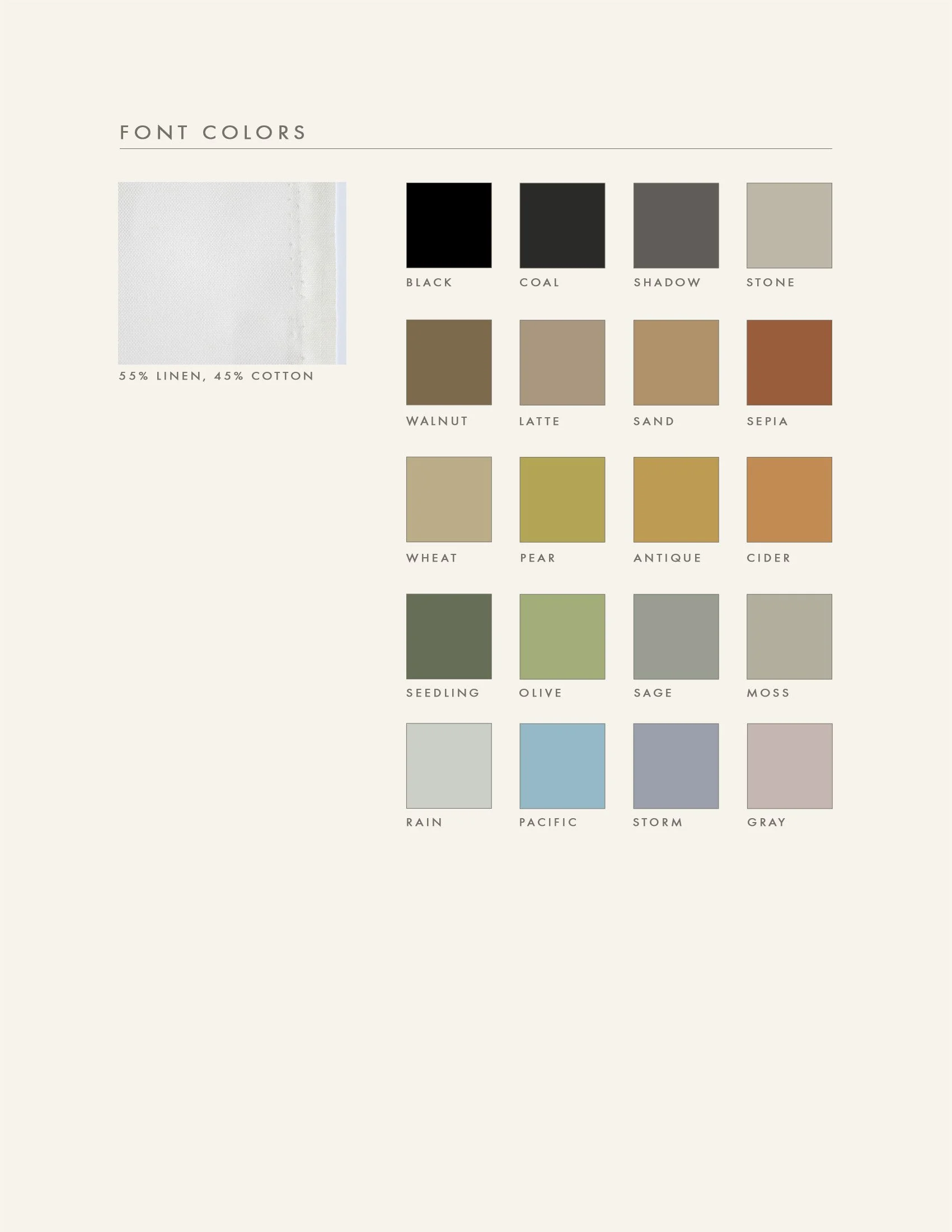 -Fabric: 30% linen, 70% cotton blend in natural (7.67 oz) or 100% linen in off-white (3.8oz) that is ethically and sustainably produced